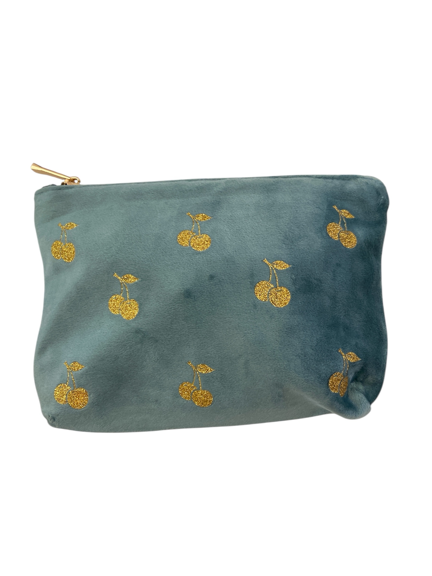 Cette trousse en velours de couleur jade séduit par son effet doux et luxueux au toucher. Chaque pièce est embellie de cerises dorées pailletées soigneusement appliquées sur le recto, offrant un éclat subtil mais irrésistible. Idéale pour les personnes qui aiment les accessoires originaux et tendance, elle se glisse facilement dans un sac à main, une valise ou une trousse de toilette.