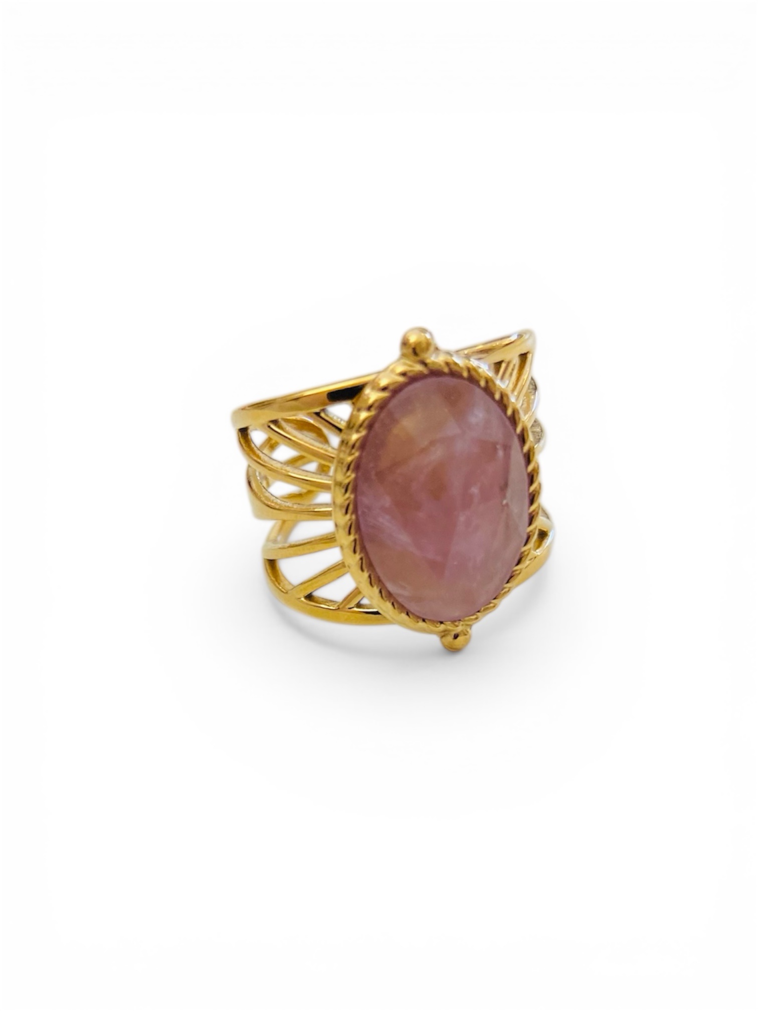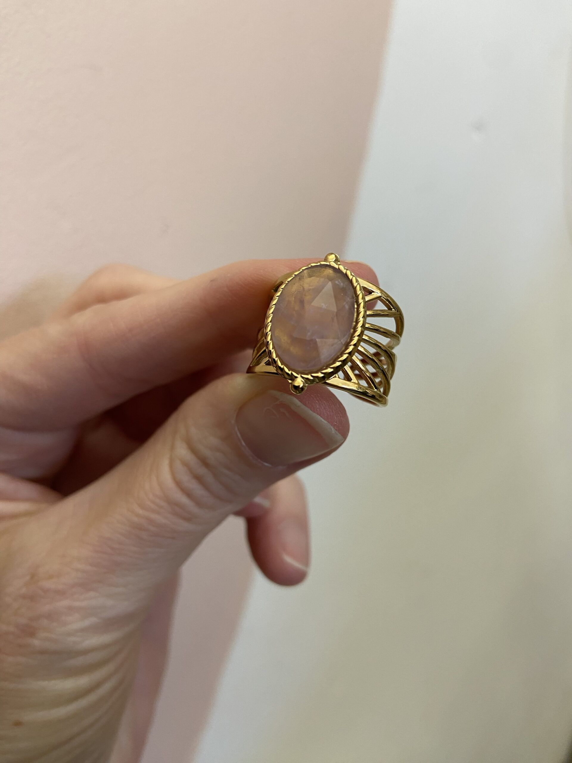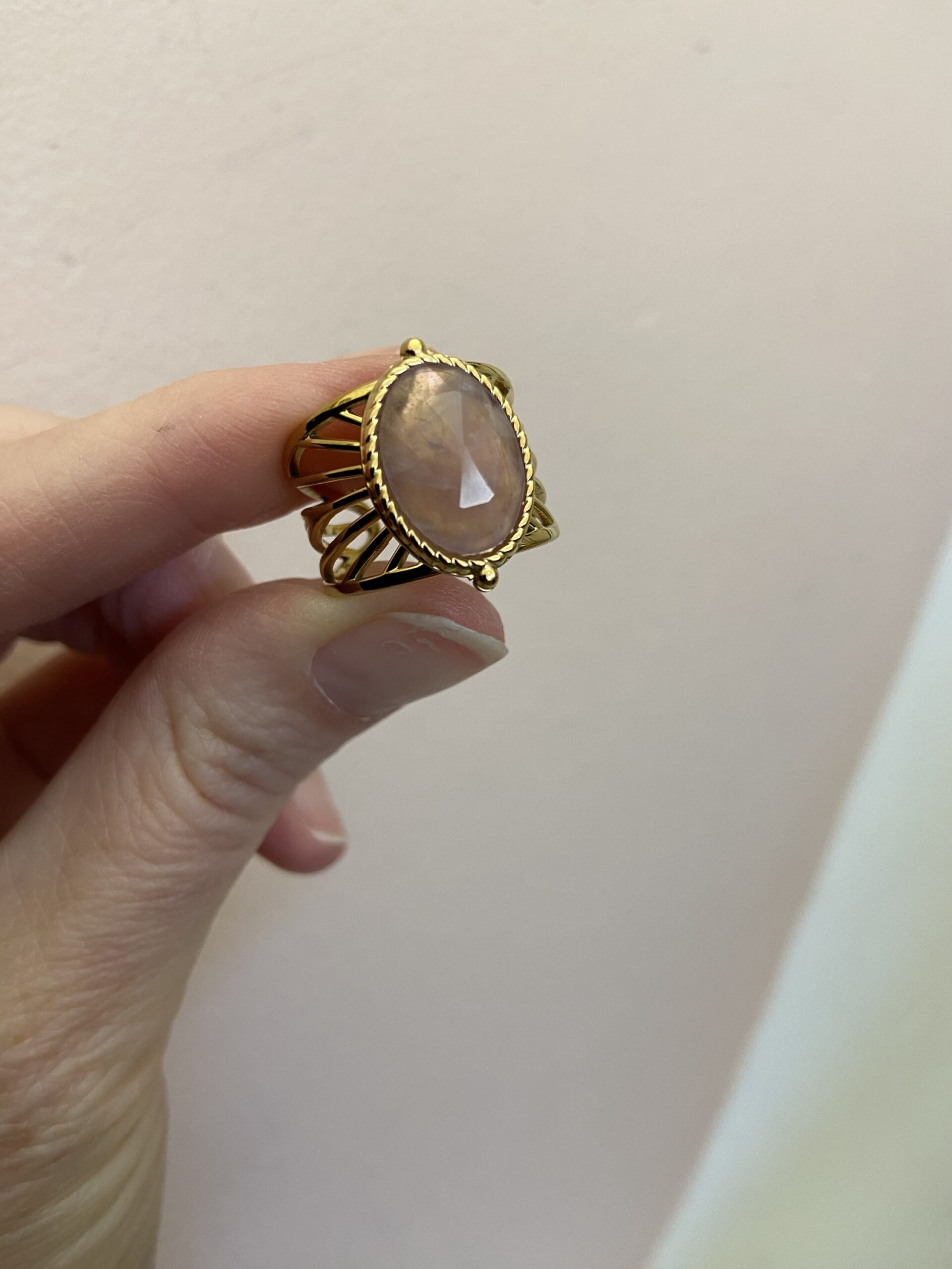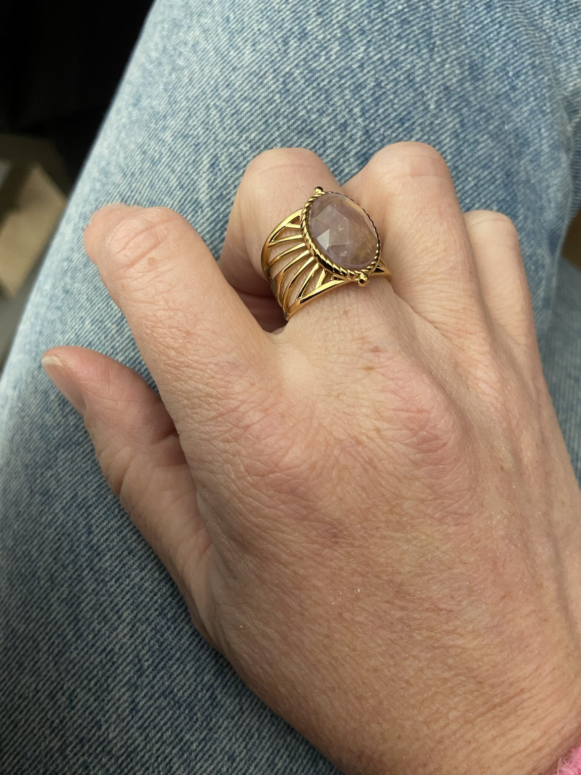 Loin des violets profonds, cette améthyste claire joue la carte de la subtilité — ses tons rosés, beiges et légèrement irisés changent selon la lumière, révélant parfois un souffle de violet. Sertie dans une monture en acier inoxydable doré aux nervures striées, c’est une bague affirmée qui sait aussi se faire poétique.