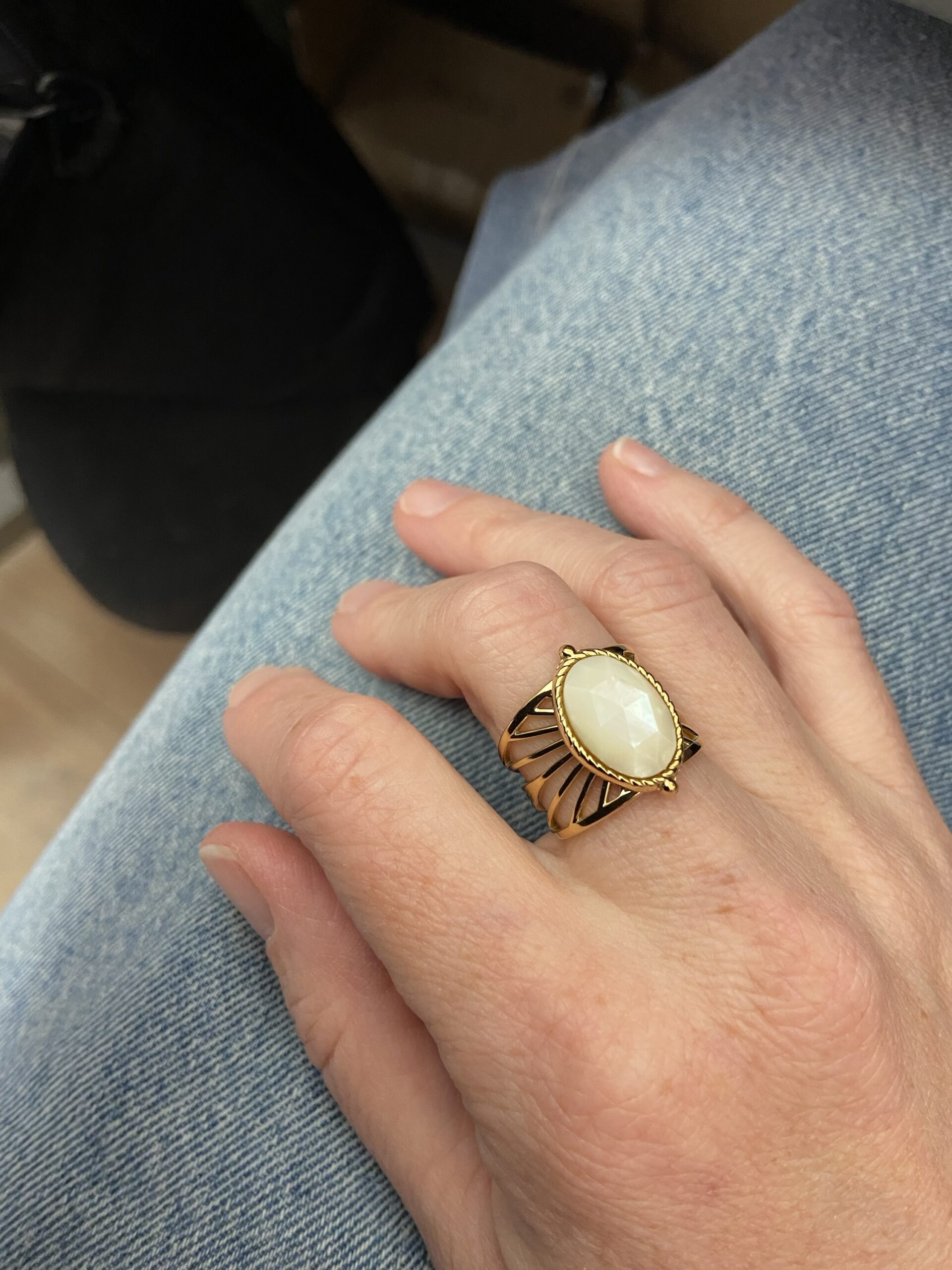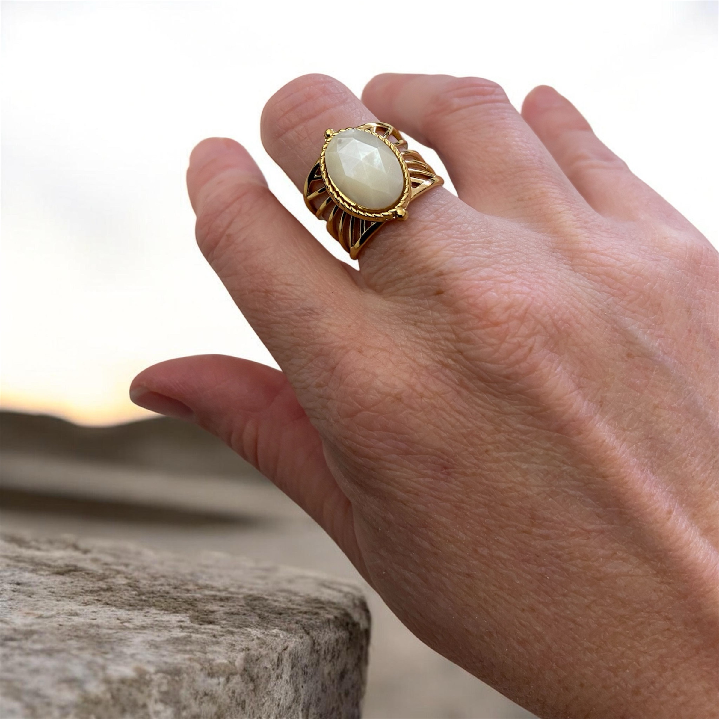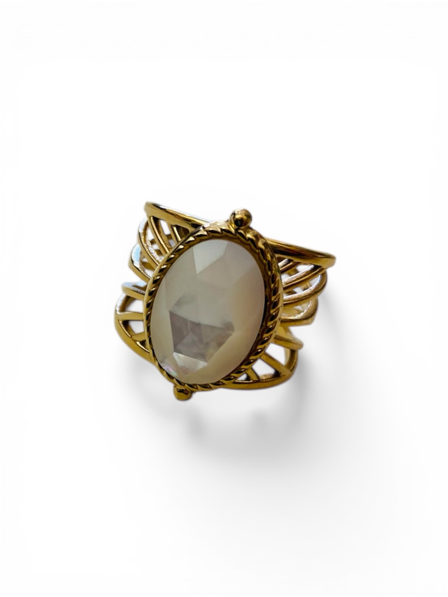 Cette bague imposante et délicate à la fois capte la lumière à chaque mouvement. Sa pierre de nacre ; aux reflets nacrés blanc ivoire, irisés et doux ; est sertie dans une monture en acier inoxydable doré aux nervures striées, évoquant une couronne ou un soleil. Une pièce élégante avec du caractère.