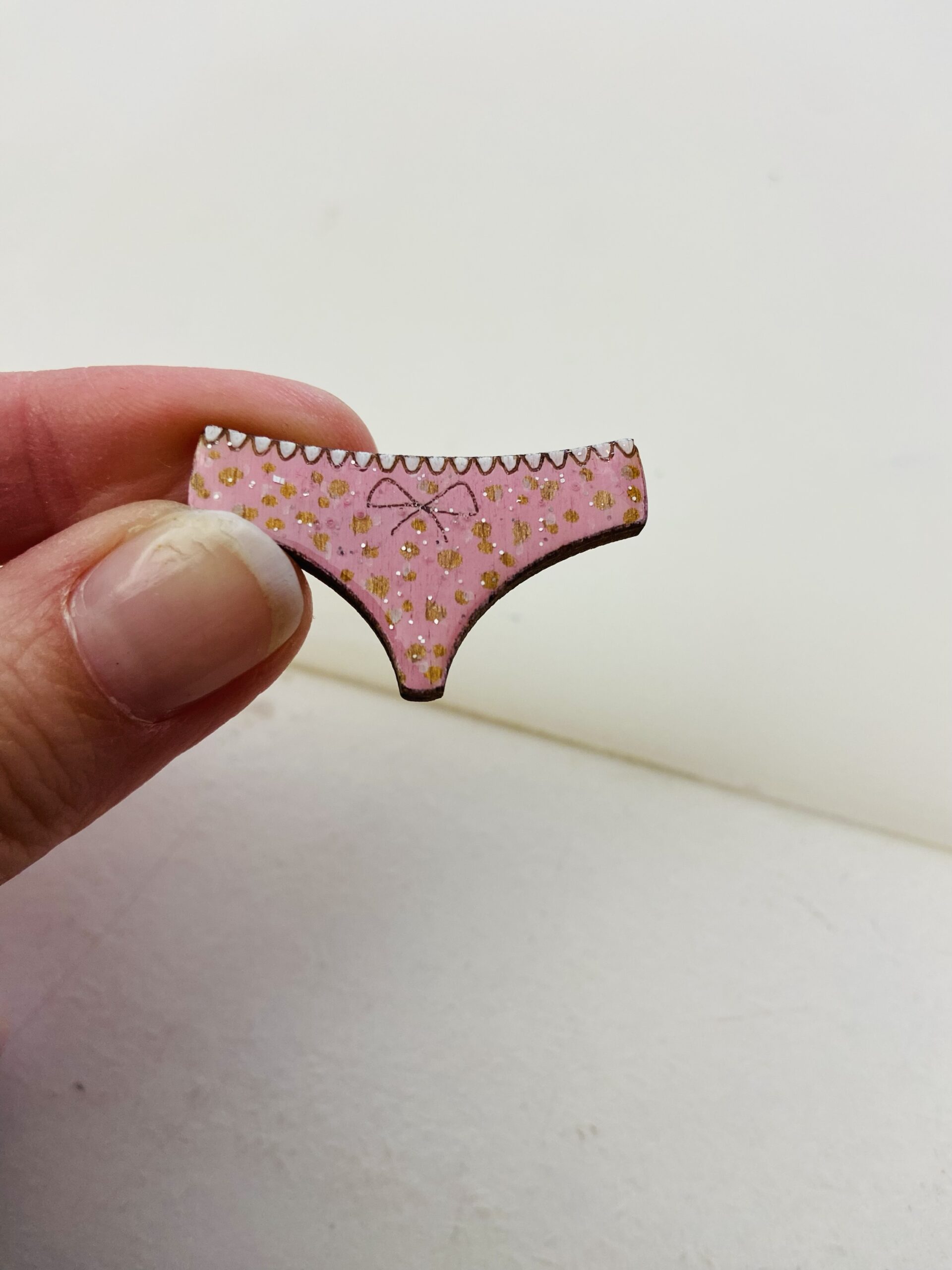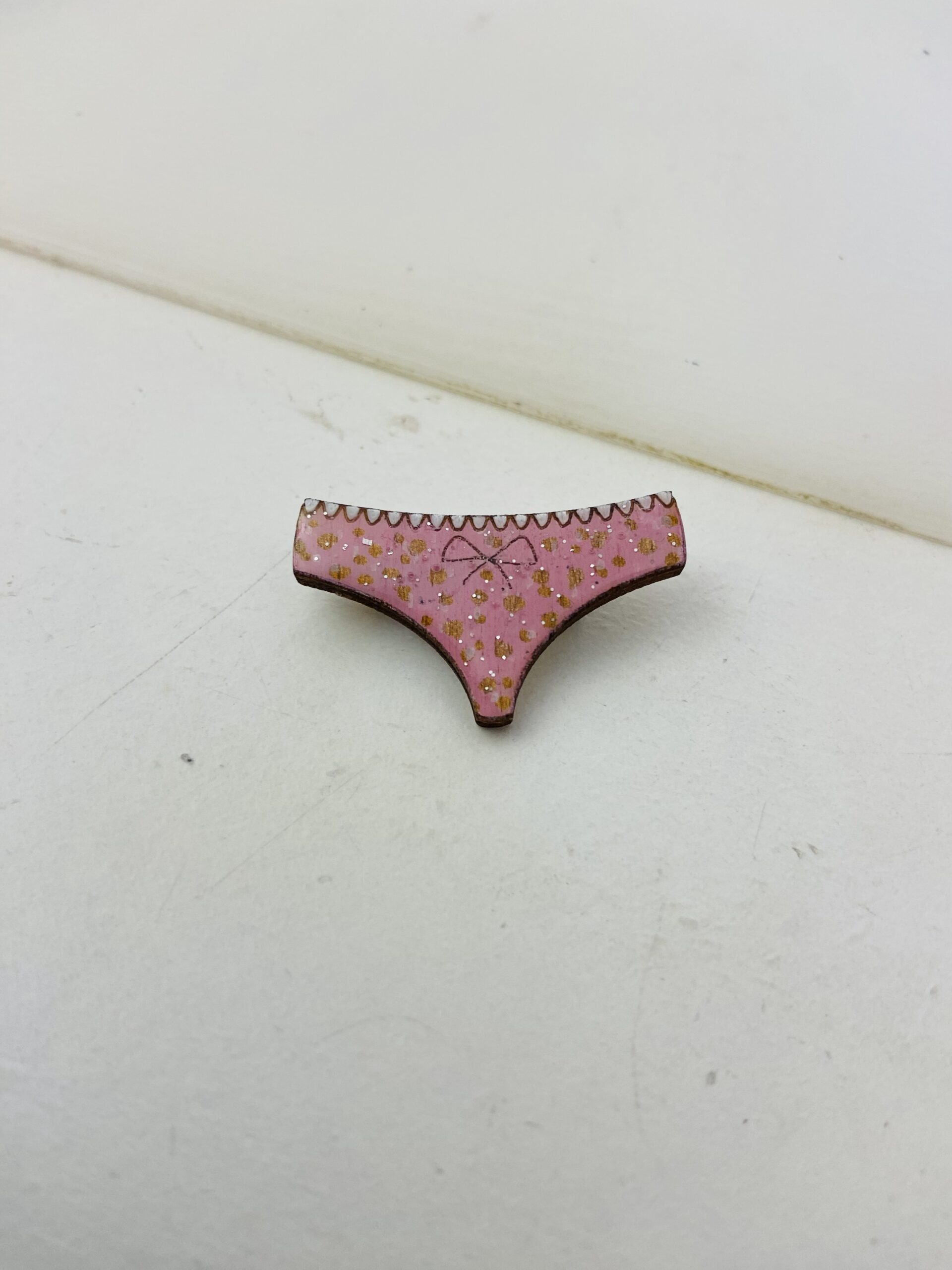 Craquez pour notre broche culotte rose à pois pailletée, un accessoire aussi original qu’élégant, entièrement réalisé à la main dans notre atelier.